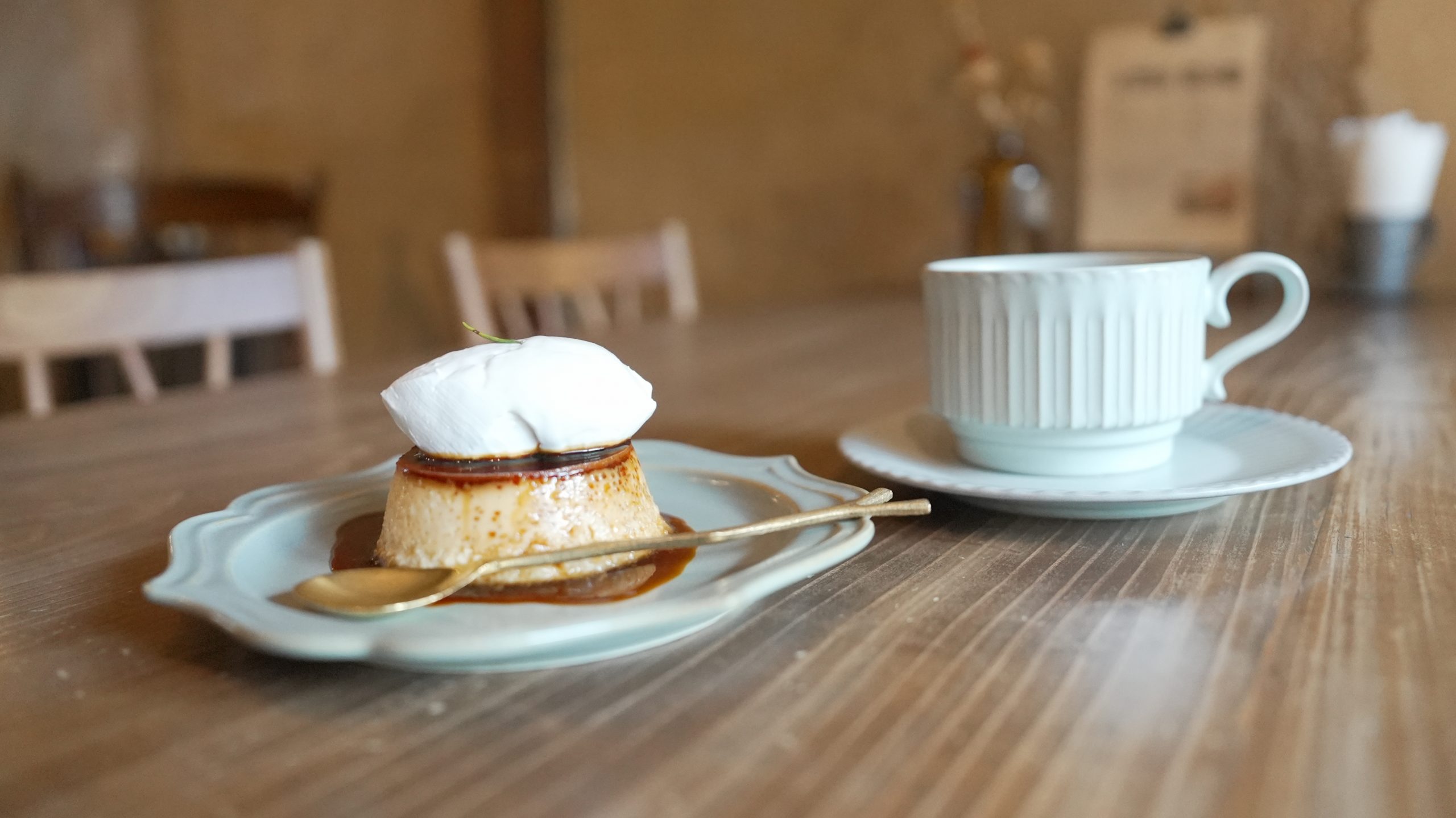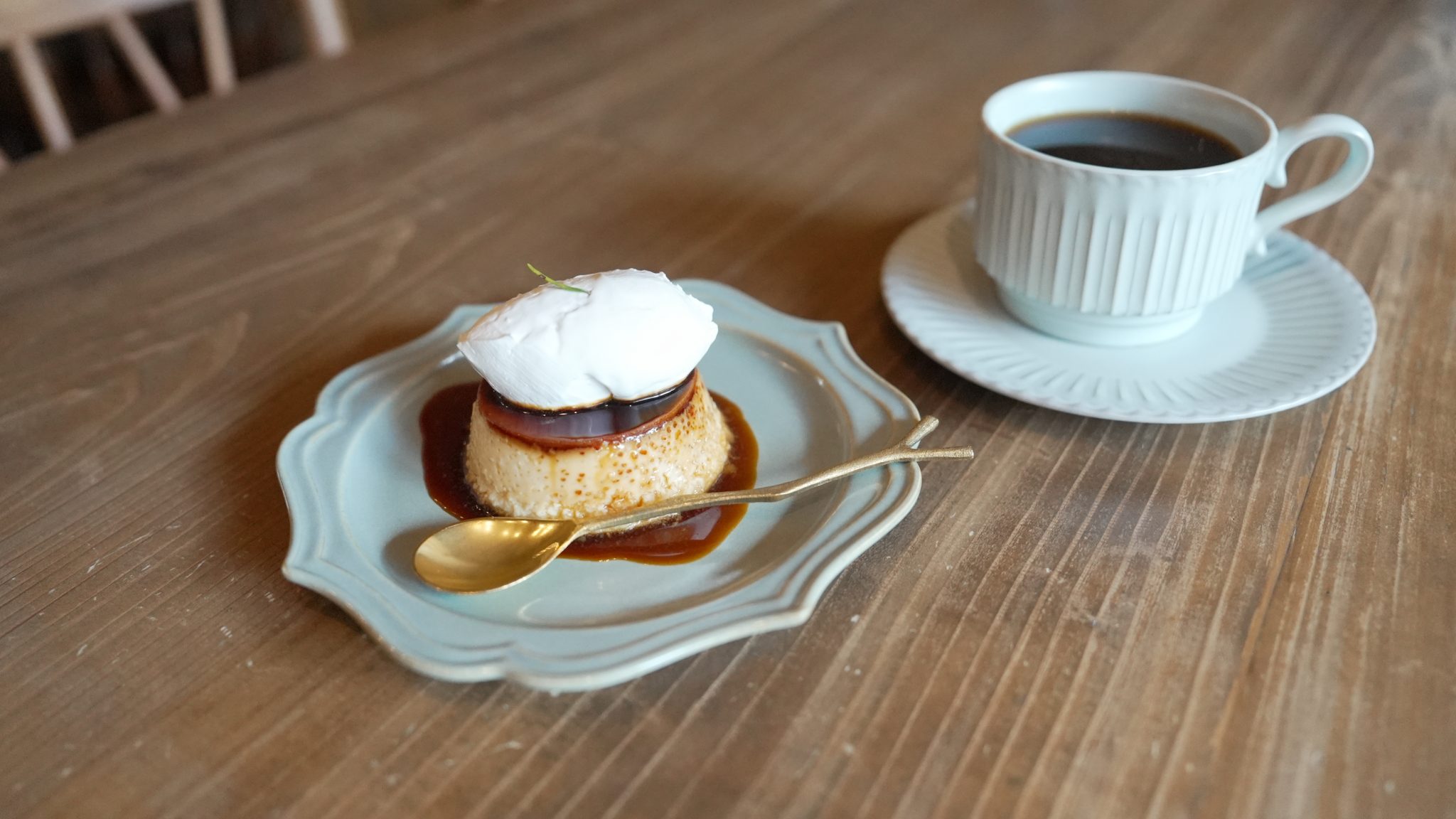 ほろ苦いカラメルがたっぷりかかった固めのプリンにホイップクリームをトッピング。ほろ苦さとクリーミーさのバランスが絶妙で、すっきりとしたコーヒーと好相性。
