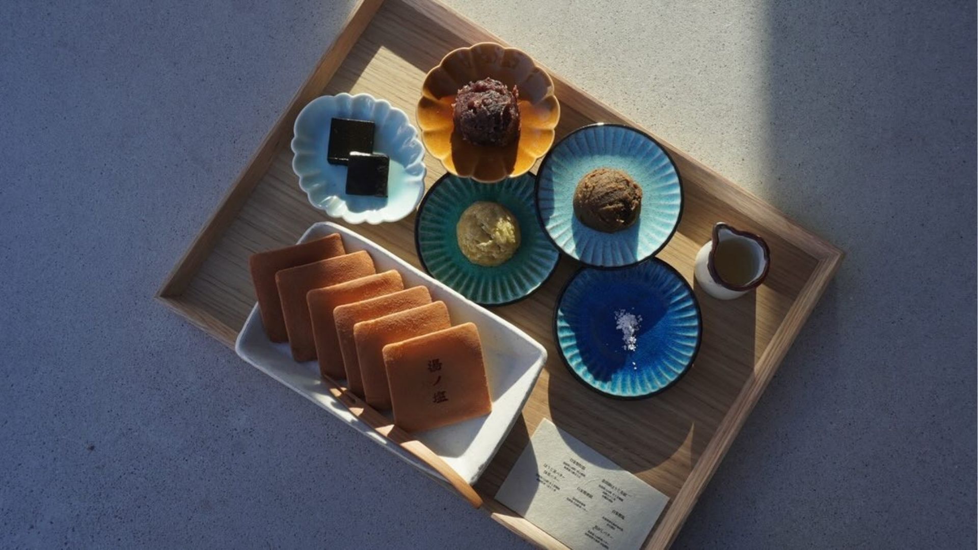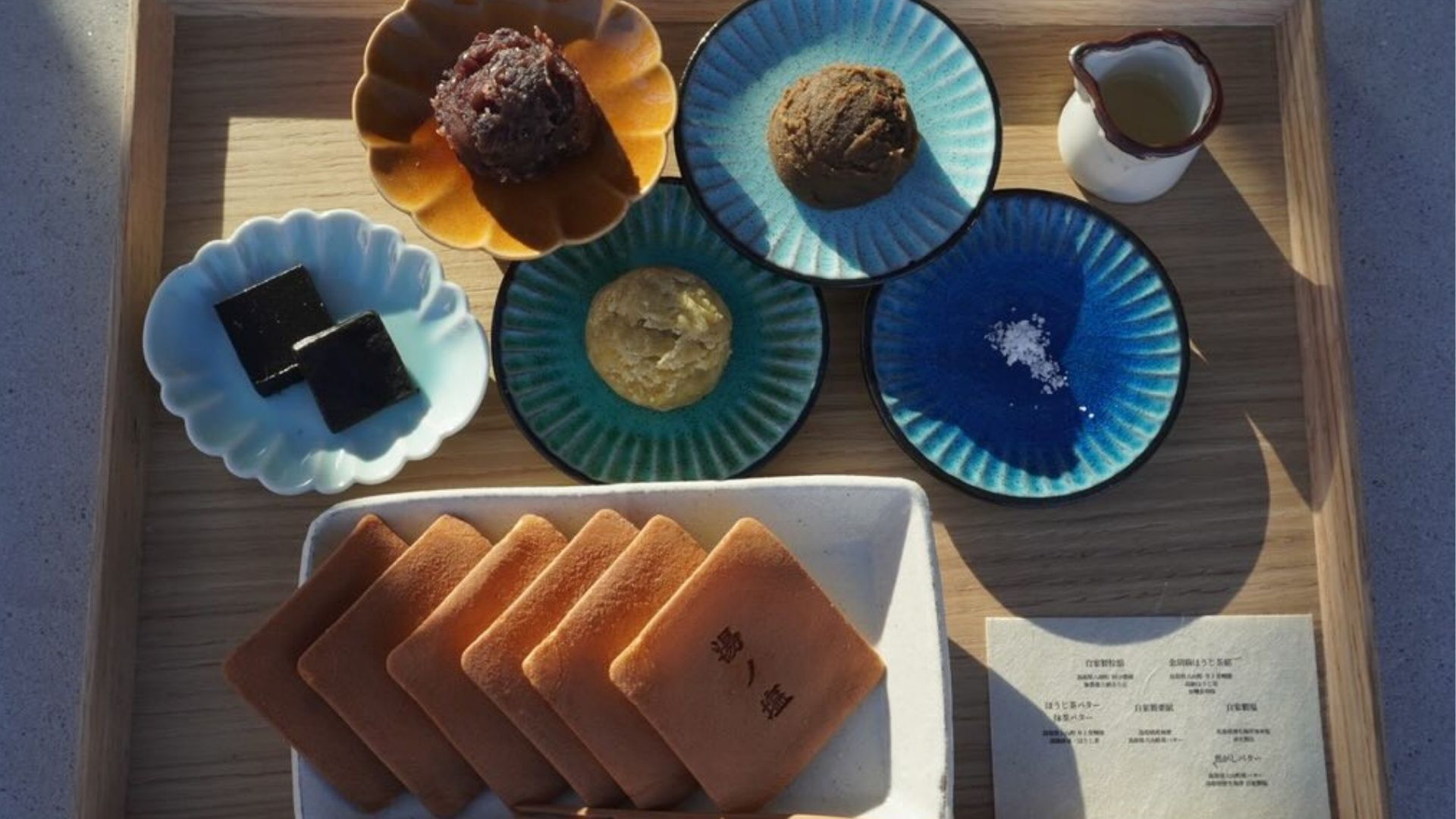 それが「20通りの手作りどら焼き」(1,000円)。小皿に盛られたあんやバター、自家製塩を自慢の皮にはさんだりのせたりして自由に楽しめるメニューです。