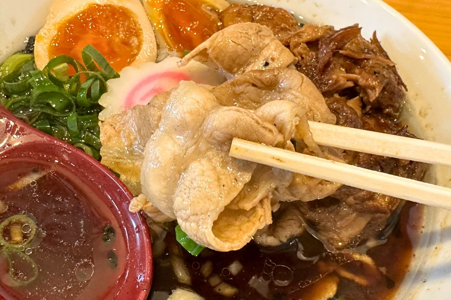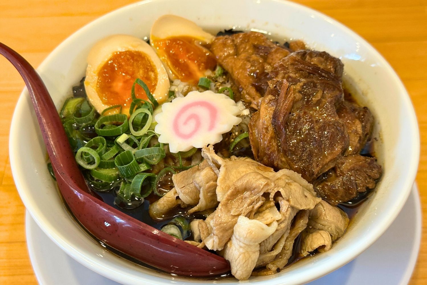 2種類の肉に味玉が乗せられたラーメンは、麺が見えないほど具だくさんで、そのビジュアルに圧倒されます。