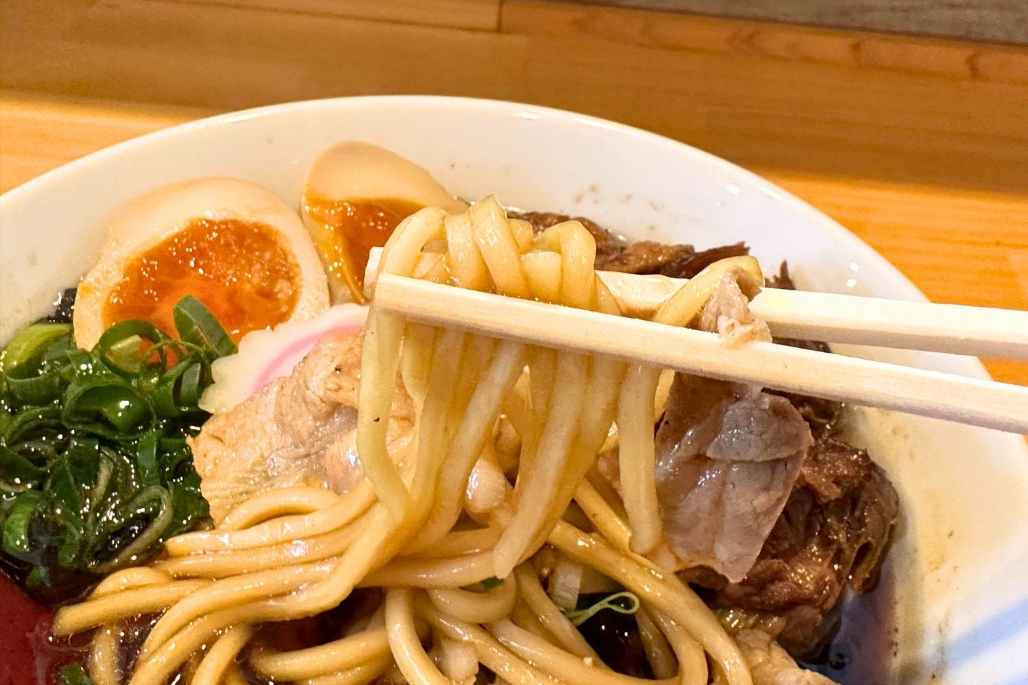 スープは牛骨特有の甘みと強いコクが際立ち、醤油ダレで甘辛い味わいに。玉ねぎを焦がした香味油が香ばしさをプラスしており、食欲をそそります。