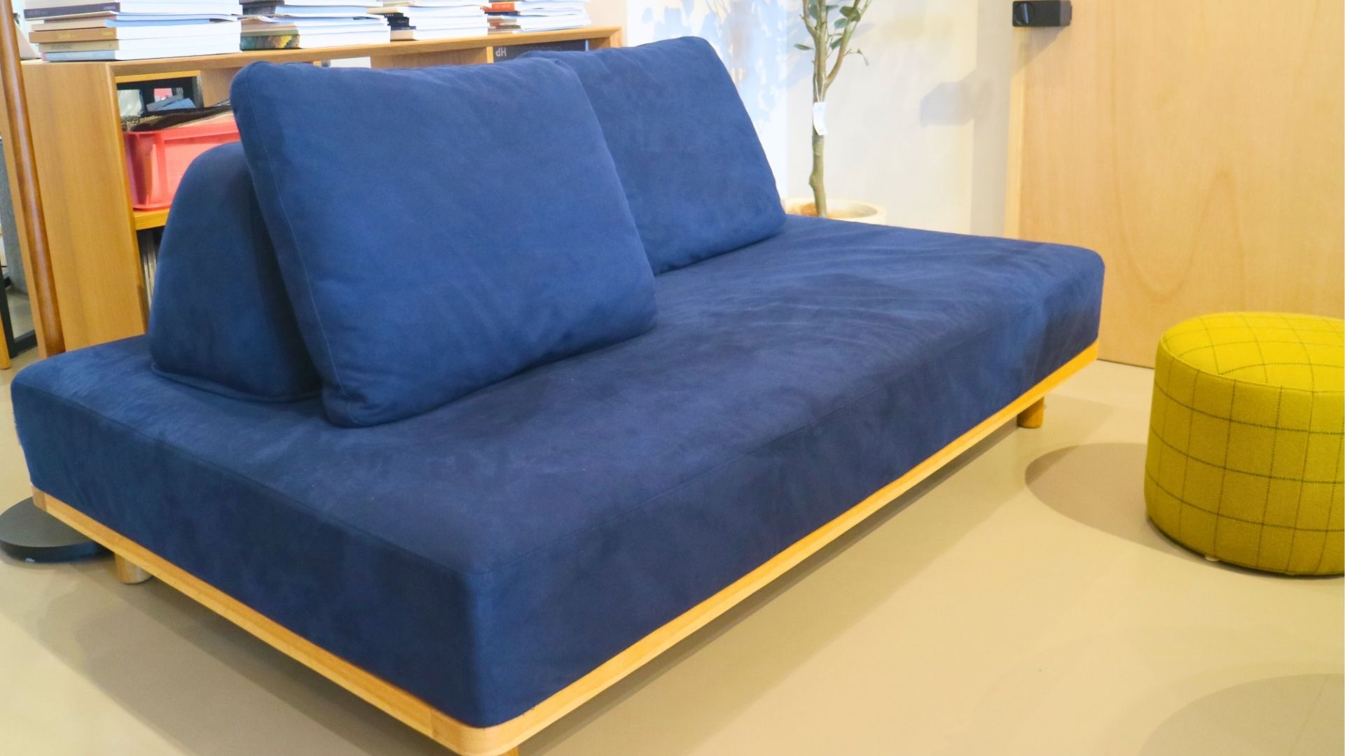 店内で目を引くのが、Fumiの「無駄のないソファ」。背もたれ部分を移動できるのが特徴で、座る人の体形や用途に合わせて形状を変えられます。