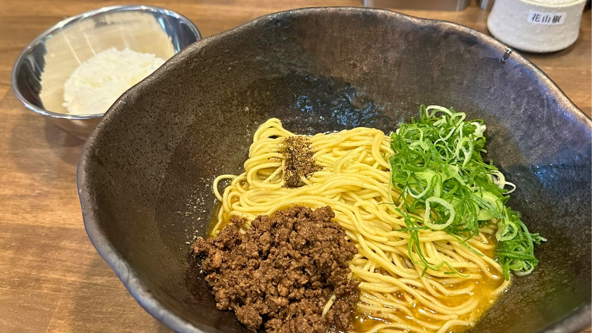 メニューは汁なし担担麺と汁あり担担麺の2種類。今回は汁なし担担麺の並盛り(780円)に、唐辛子と山椒をそれぞれ2辛(普通レベル)、〆として追い飯(100円)をオーダーしてみました。
