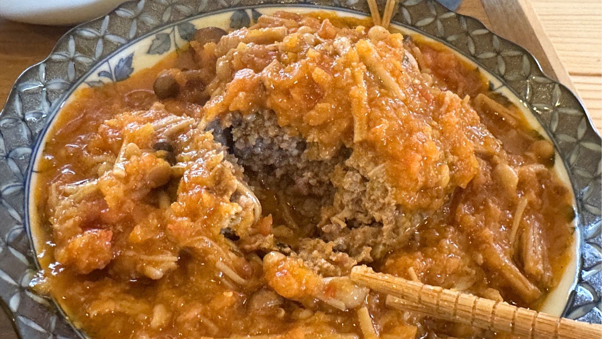 メインのハンバーグはふっくら、旨味たっぷり。キノコのソースはコクがありつつ、トマトのほどよい酸味でさっぱりいただけます。