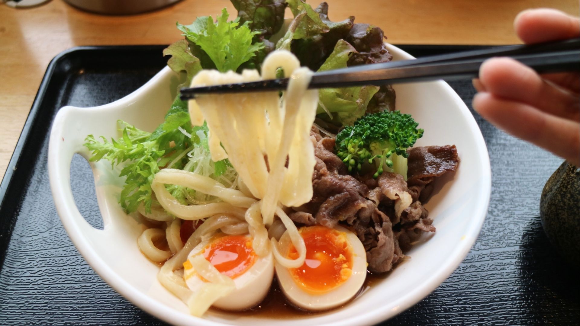 柔らかく旨味たっぷりのお肉ととろとろの卵をからめて食べるうどんは、こってりコクのある味わい。生野菜のさっぱり感がマッチしています。