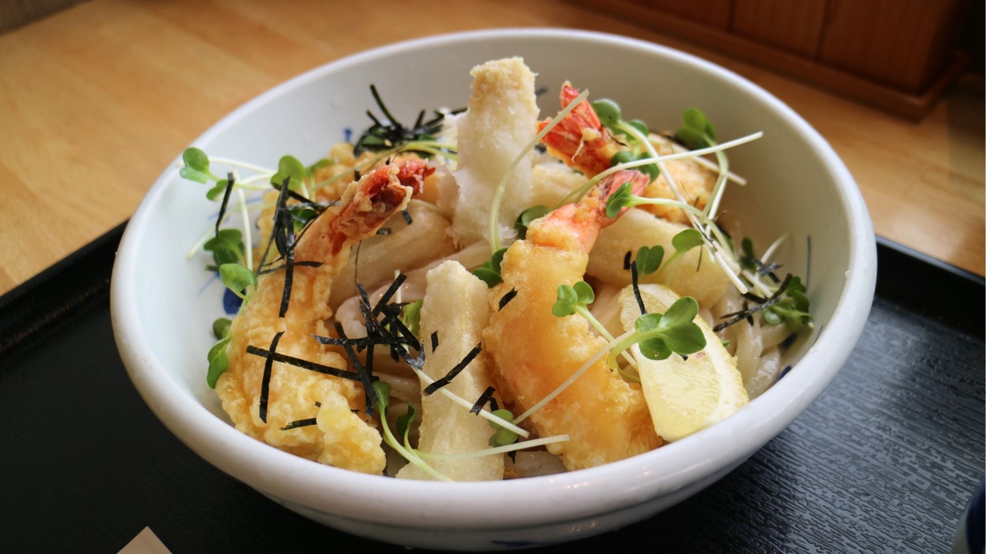 「えび餅うどん(冷かけ)」(1,200円)は、えびと餅の天ぷらが乗った一品。