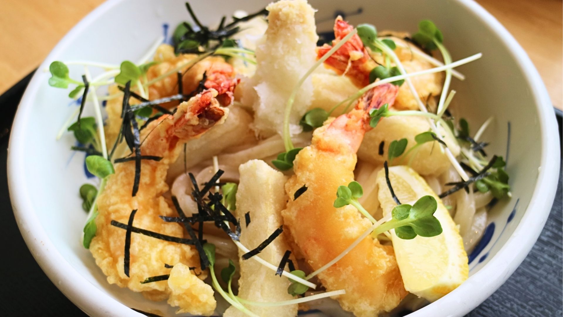 えびの天ぷらはしっかりとした歯ごたえ。餅は島根県産米を使用した自家製。しょうがの風味が爽やかなうどんと、がっつり感のある天ぷらの組み合わせが絶妙です。