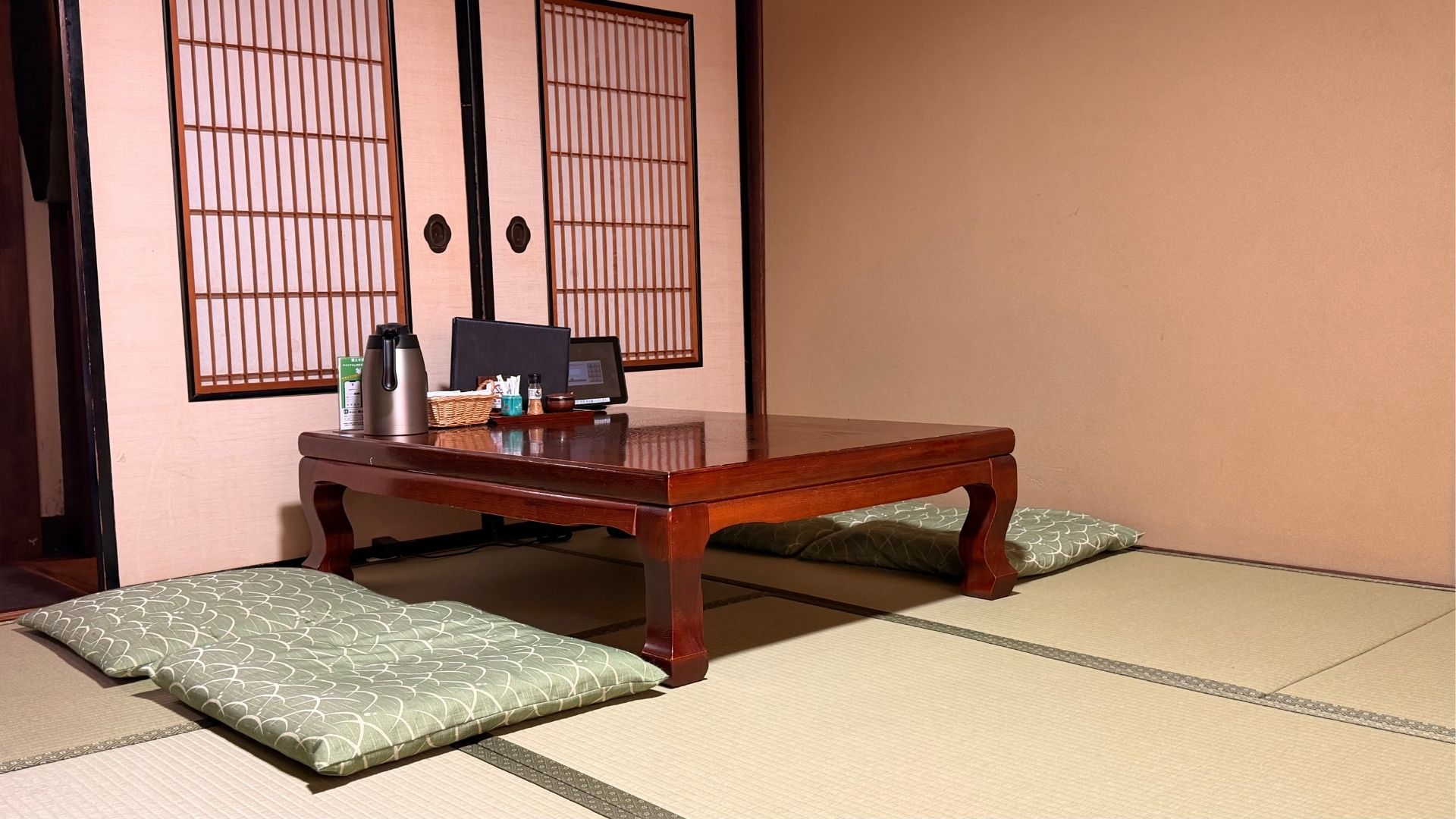 店内はテーブル席と座敷(広間)を備え、席の間隔が広くゆったりとした構成。