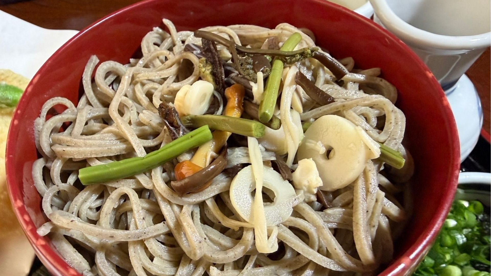 もう一品おすすめしたいのが「三色割子そば(山菜・山芋・揚げ玉)」(天ぷら付き2,050円)。