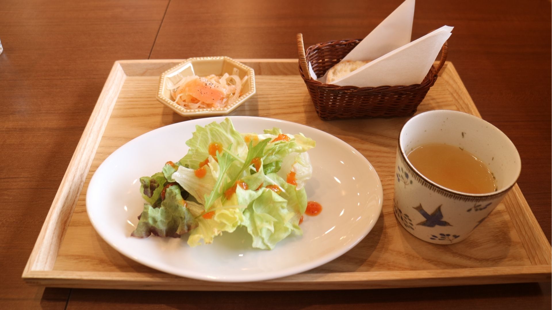 サラダ、スープ、小皿、バゲットも付いてくるので、満足感も十分!サラダのドレッシングも美味しいです。