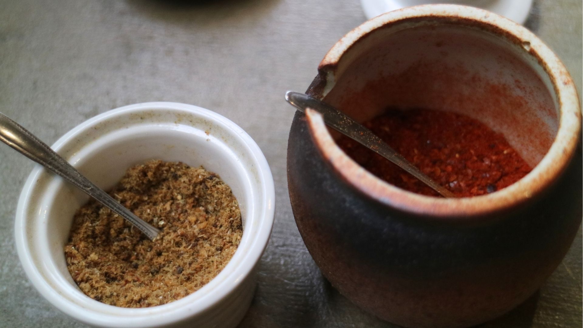 これらのカレーはほとんど辛味がないため、卓上の唐辛子で好みの辛さに調整します。