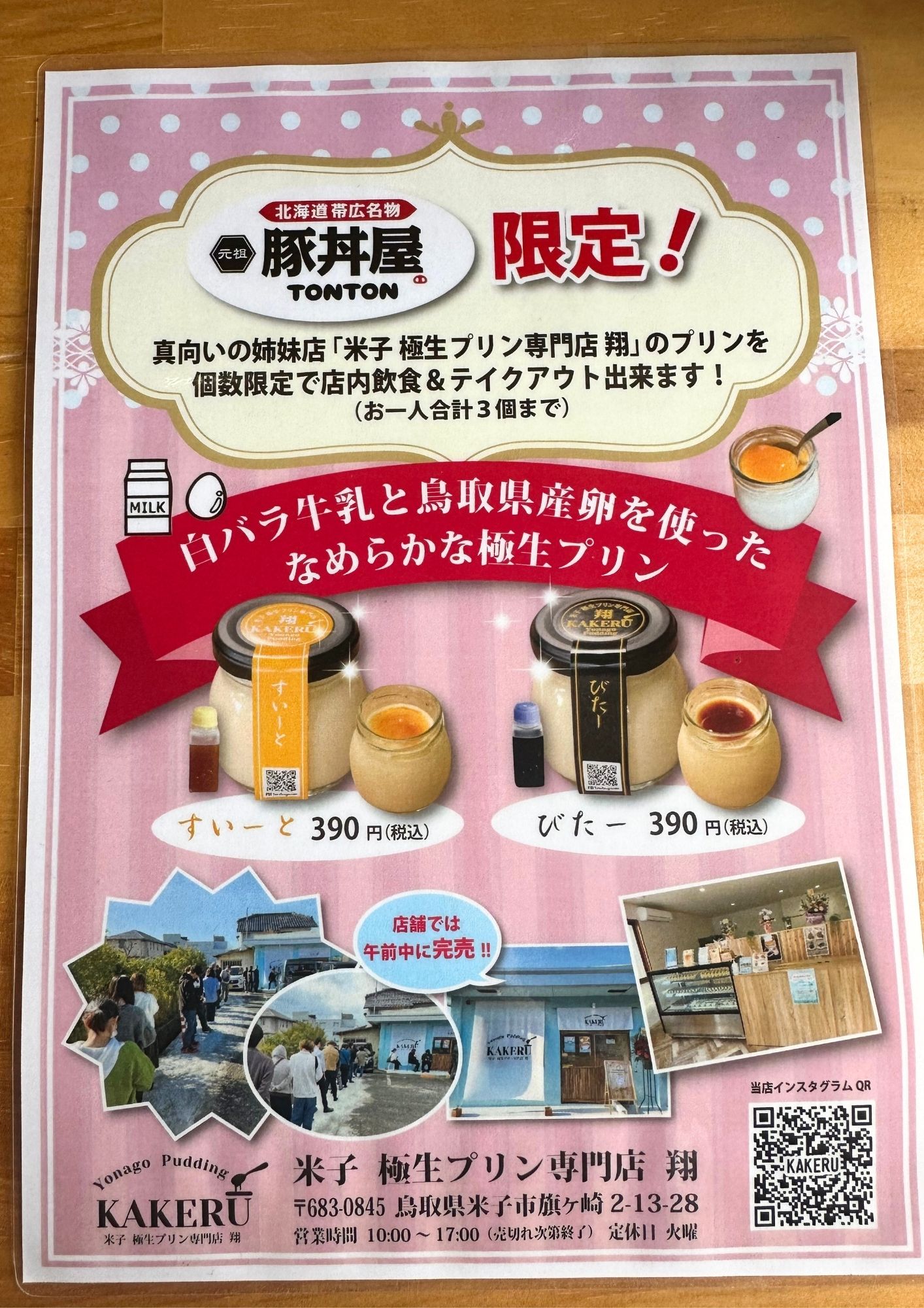 ボリューム満点の豚丼を食べた後は、デザートも。向かいの姉妹店「米子 極生プリン専門店 翔」のプリンを注文することができます。