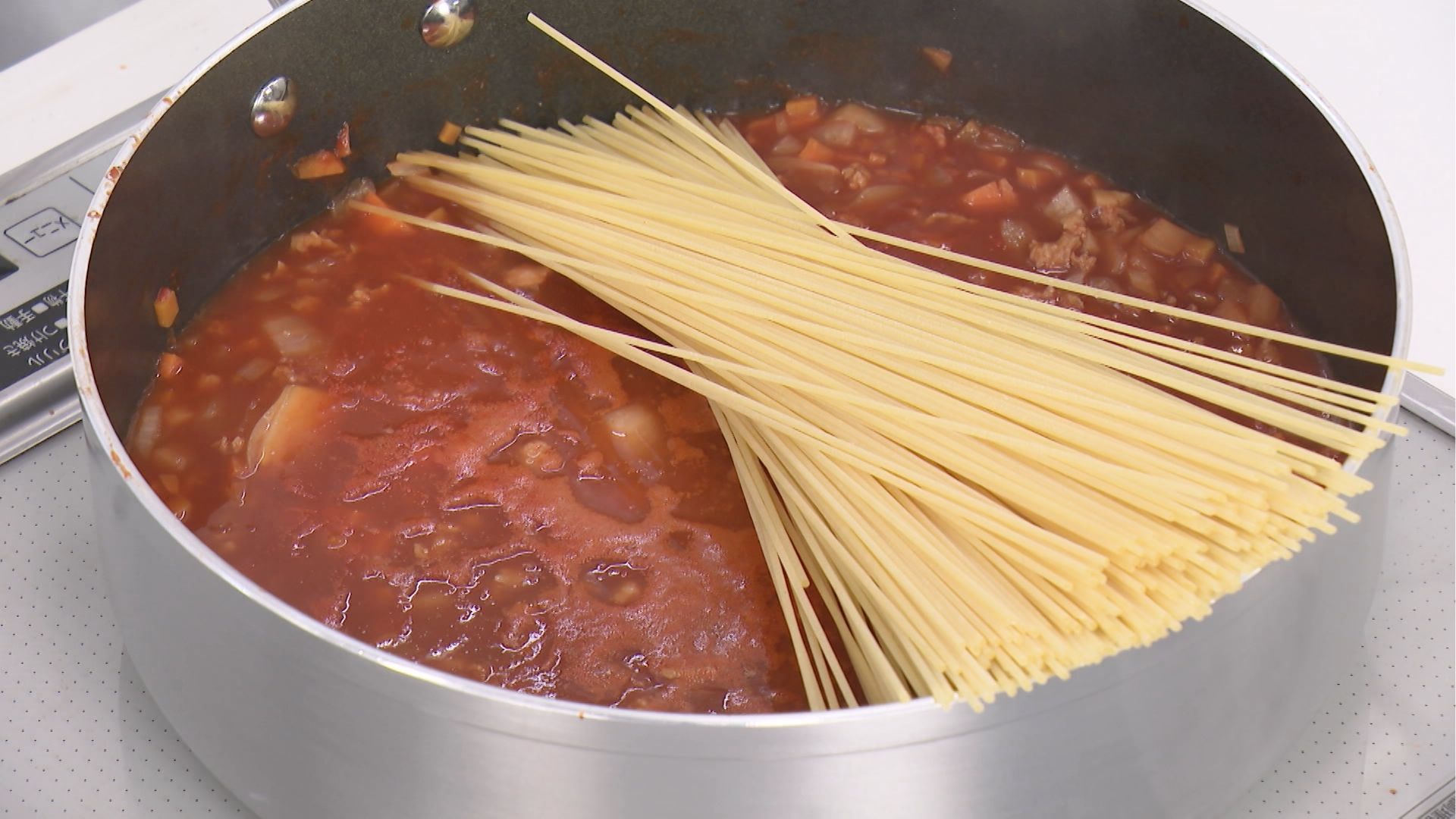 - 乾燥パスタを加え、汁気がなくなるまで煮詰める(約9分)