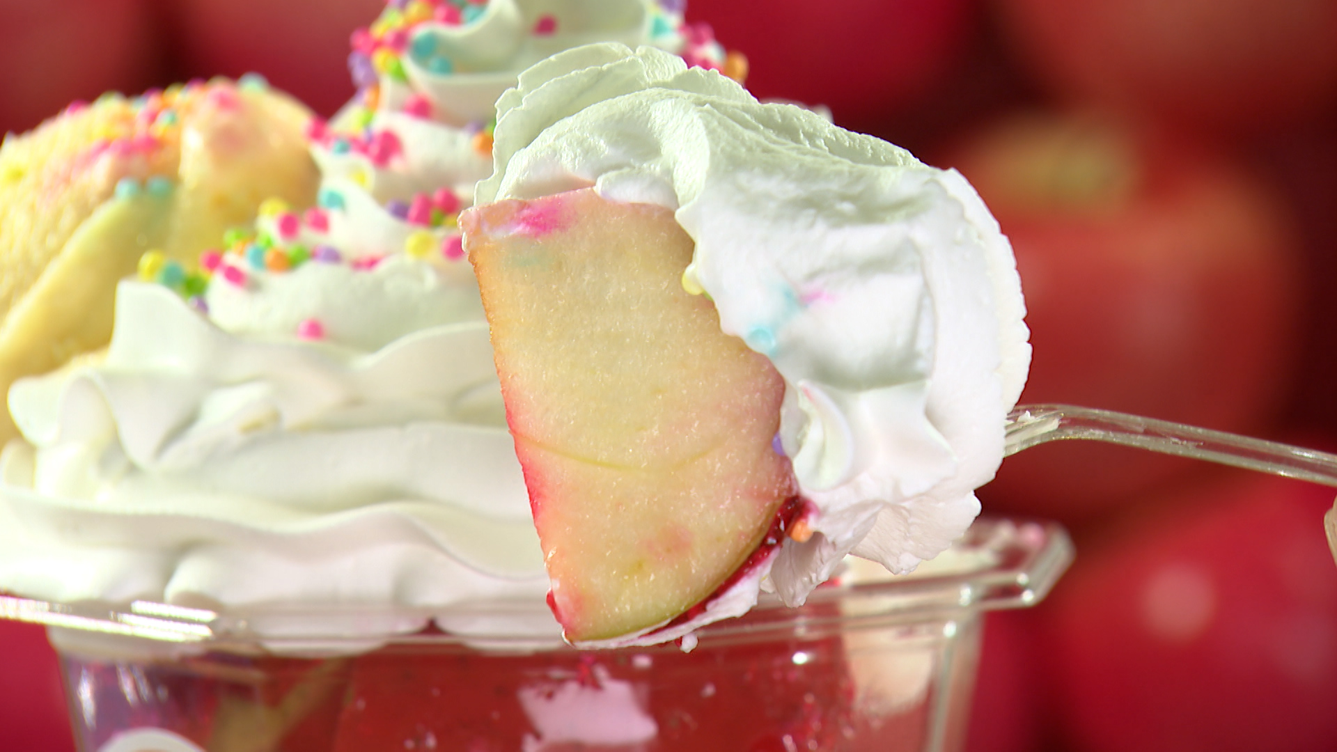 「カットりんごあめプレーン」(720円)にホイップクリーム、アイスクリーム、カラフルシュガーなどをトッピングすれば、華やかなオリジナルパフェが完成!