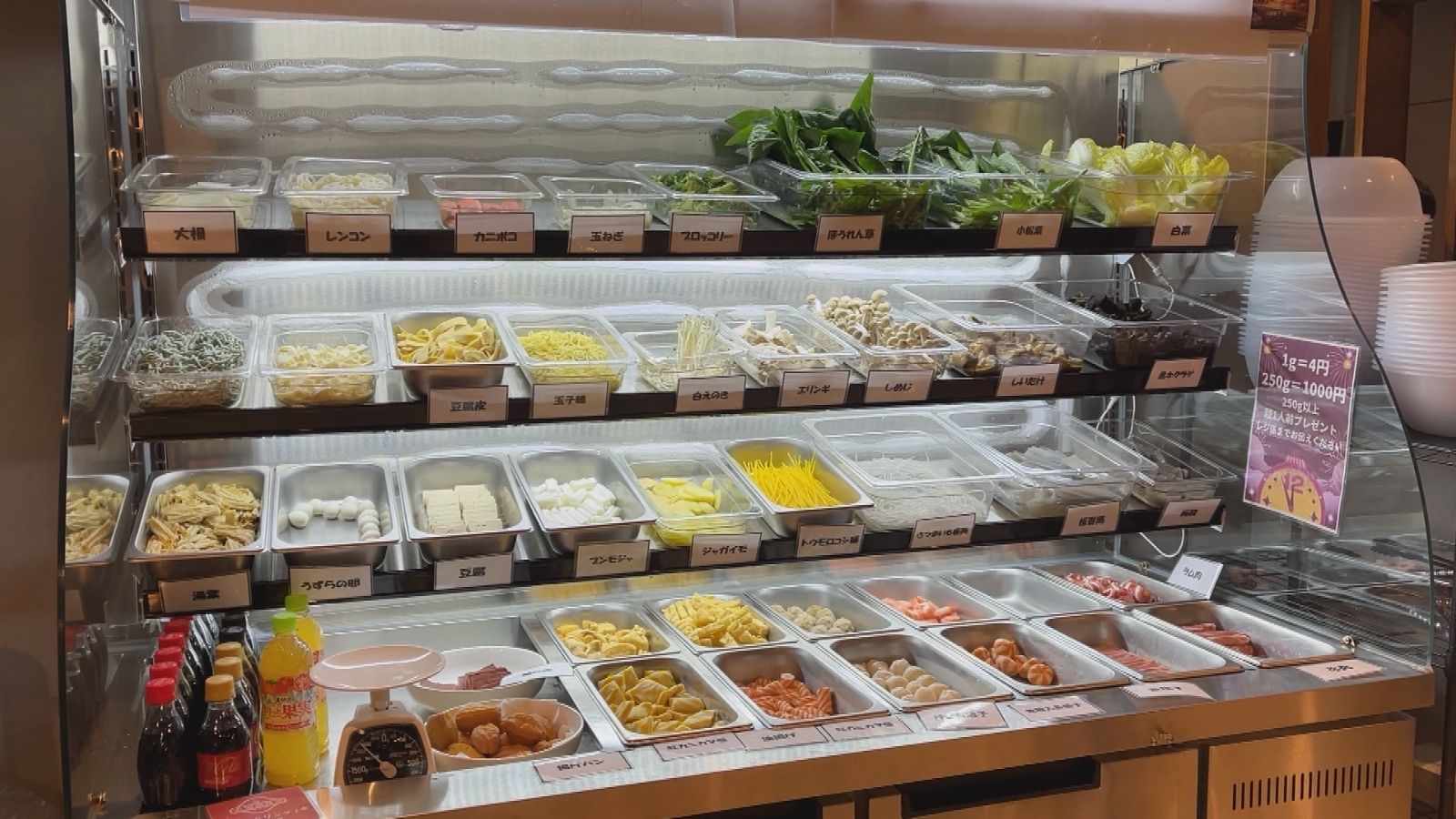 具材は1gあたり4円の量り売り制。好きなだけ取ったらレジで計量し、最後に3種類のスープ(胡麻たれ・麻辣スープ・牛骨スープ)から味を決定。厨房で調理してもらい、数分待てば熱々のオリジナル麻辣湯の完成です。