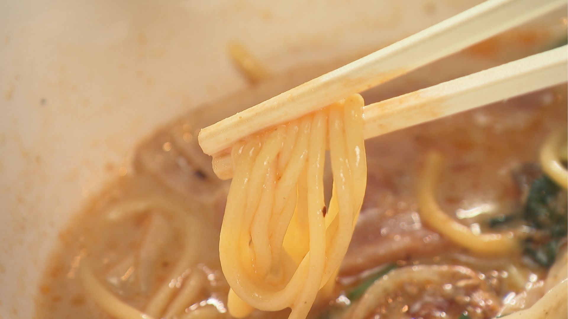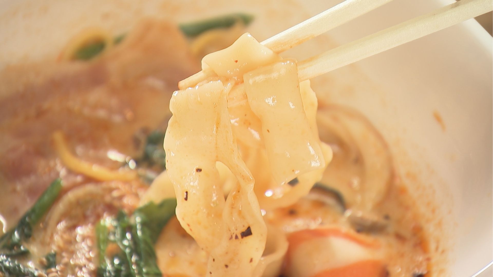 刀削麺は、生地を包丁で削りながらゆでる中国発祥の麺。幅や厚さが不均一で、ムチっとした独特の食感が楽しめます。スープとの絡みがよく、食べ応えもばっちり。