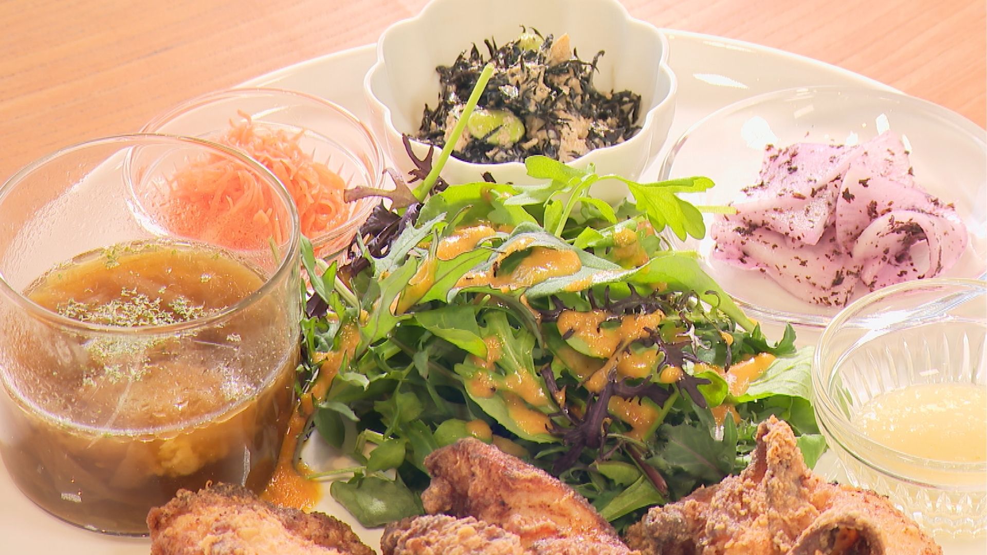プレートには日替わりのスープと小鉢3種類、フレッシュサラダも。自家製のキウイフルーツと人参のドレッシングは自然な甘さと酸味で、お箸が進む味付けです。