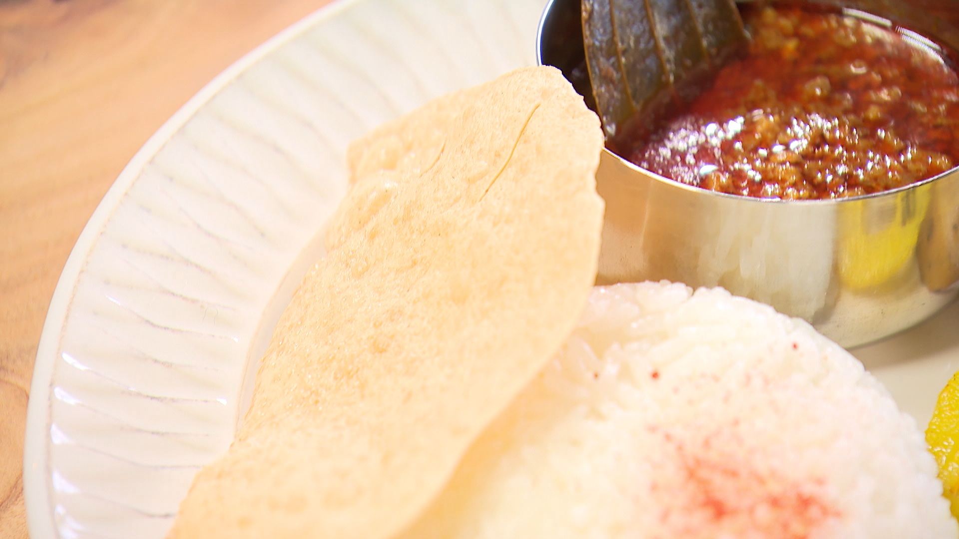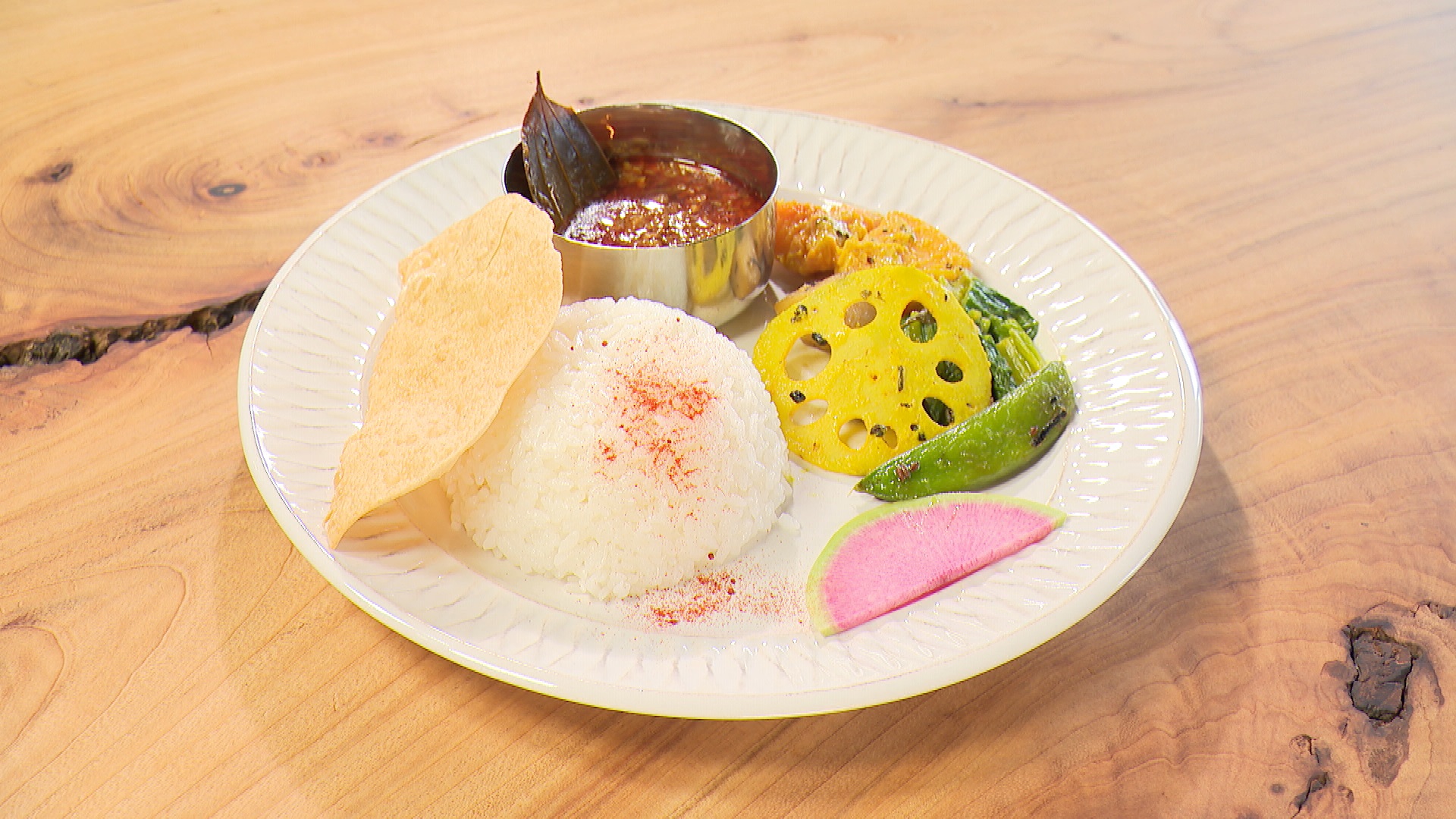 プレートにはスパイスで味付けしたカボチャやレンコンなどの副菜のほか、インドやネパールでよく食べられる薄い豆のせんべい「パパド」も。