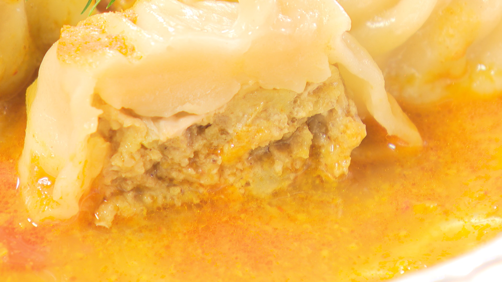 皮は厚めでもちもちとした食感。噛むと肉汁がじゅわっと出てきて、スパイシーな餡のうまみが広がります。