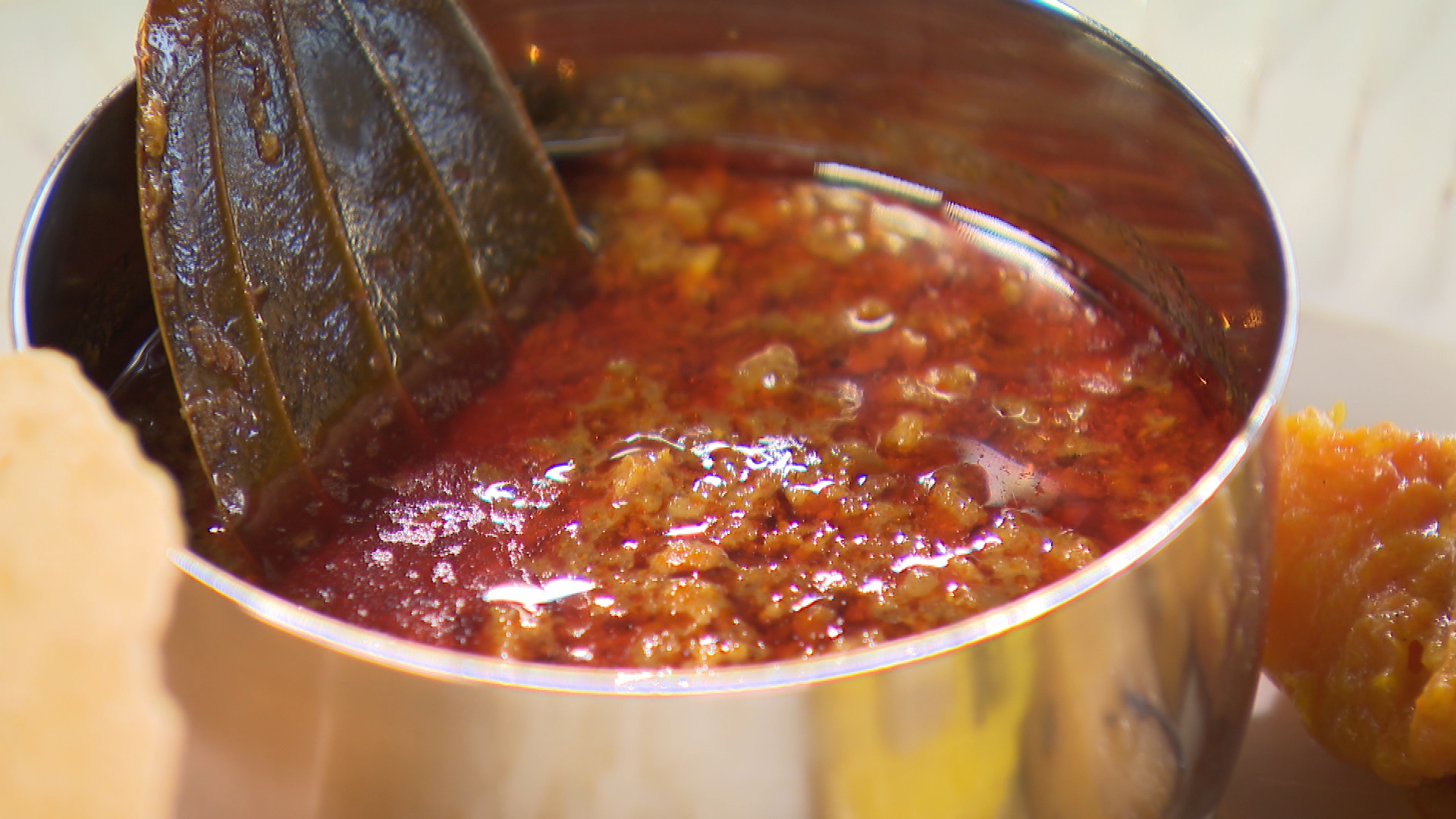 ソースはトマトをベースにスパイス、ニンニク、生姜を加えたもの。ほどよい辛さの中に甘みもあり、餡の美味しさを引き立てます。