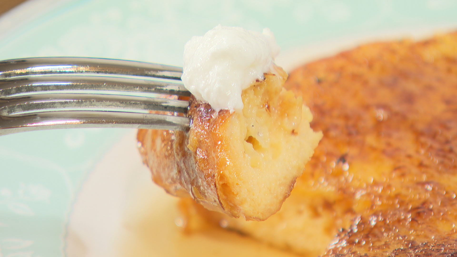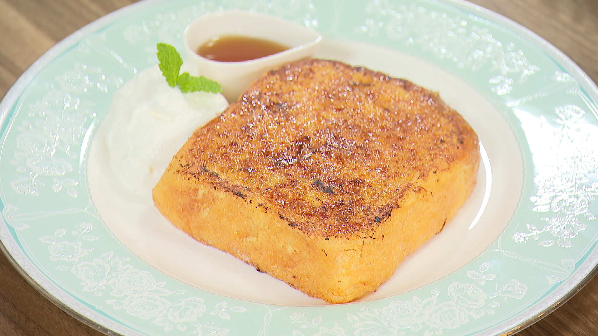 フレンチトーストにしたときの味や食感を追求し、国産小麦を使用した食パンを使っています。驚くほどふわふわトロトロの食感。噛むとバターの香りが口いっぱいに広がります。