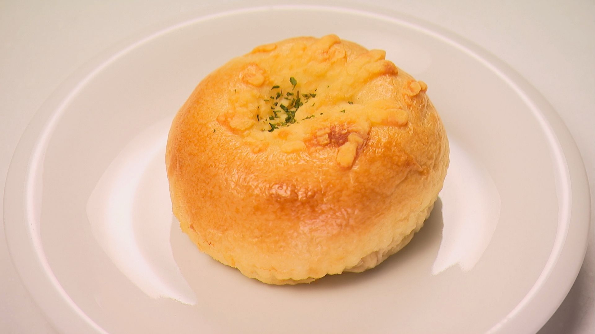 エビやイカなどの海鮮をガーリックオイルでアヒージョ風に仕上げ、ベーグルに包み込んだ一品。