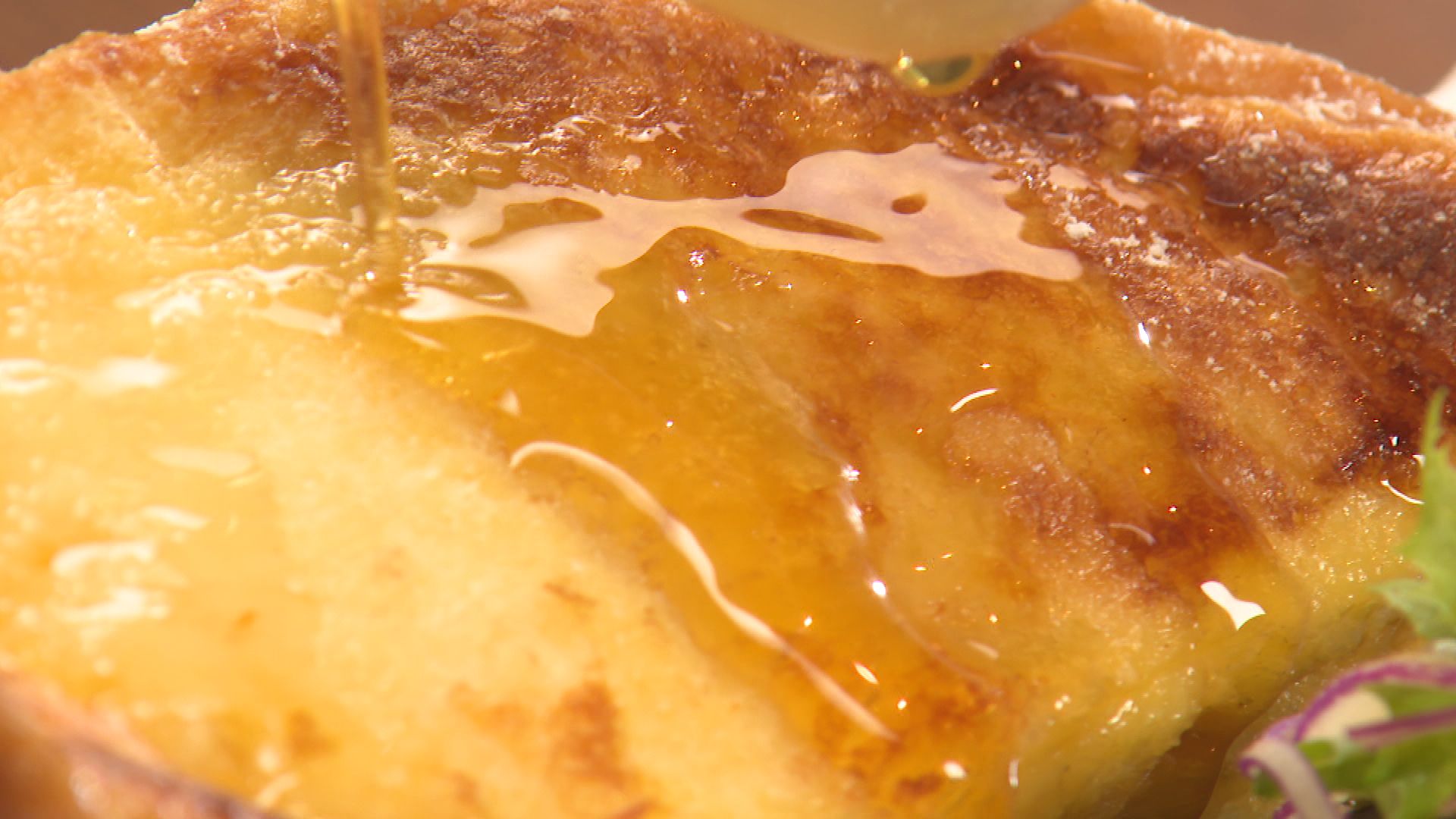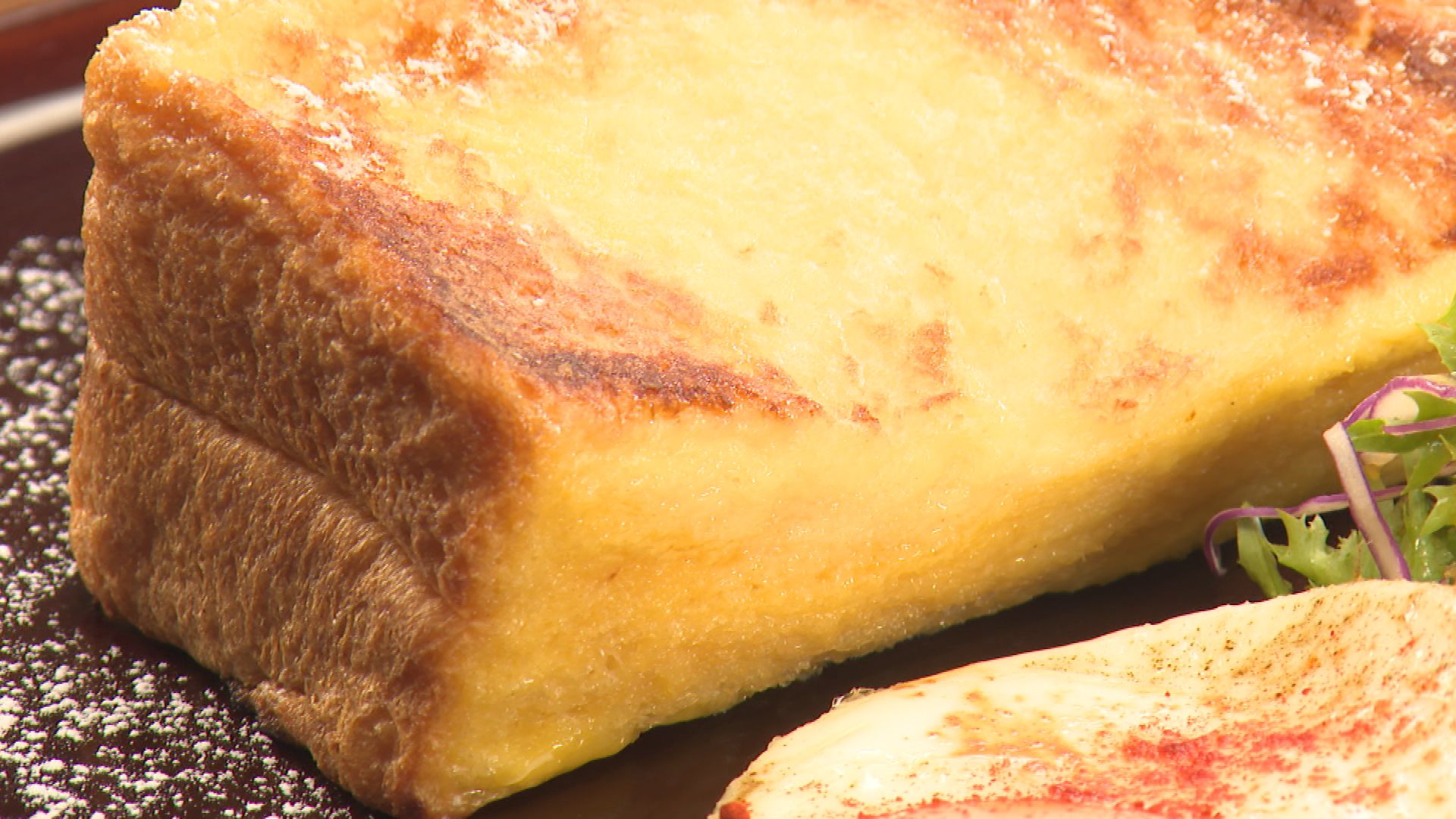 フレンチトーストの厚さはなんと5cm。牛乳を多めに加えた卵液に一晩漬け込むことで、分厚いパンの隅々までしみしみに。