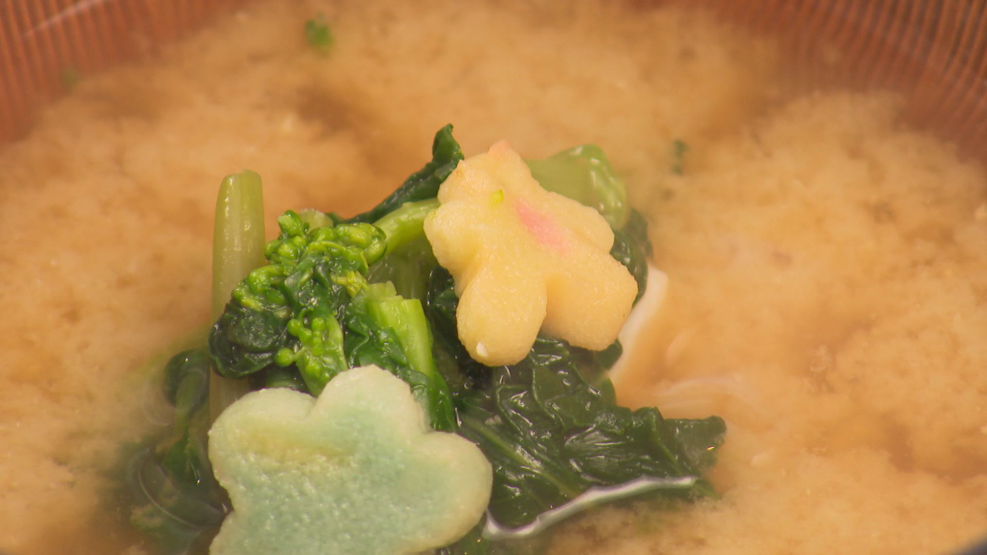 取材時の具材は豆腐、旬の菜の花とワサビ菜、そして彩りを添える花形のお麩。野菜のシャキシャキとした食感も楽しめます。