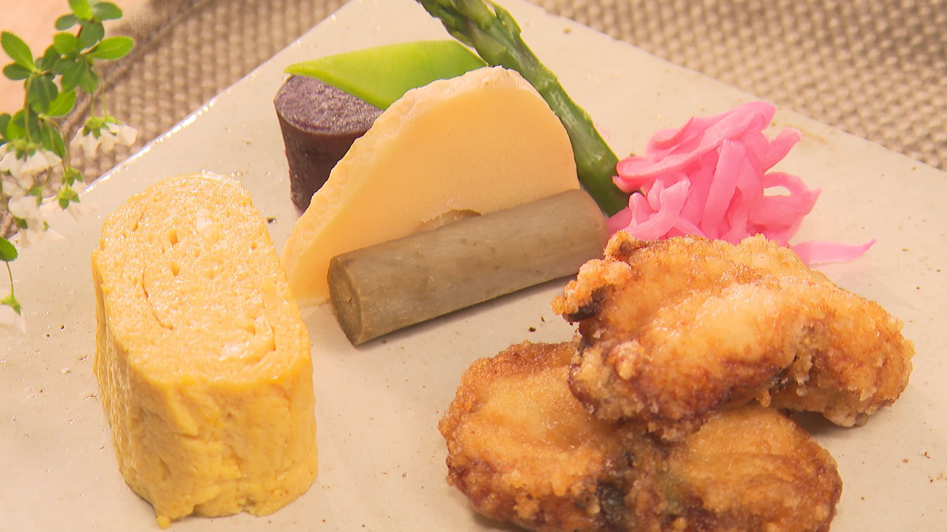 セットにはふわふわでしっとりとした出汁巻きたまごのほか、旬の地元食材を使ったおかずも付きます。