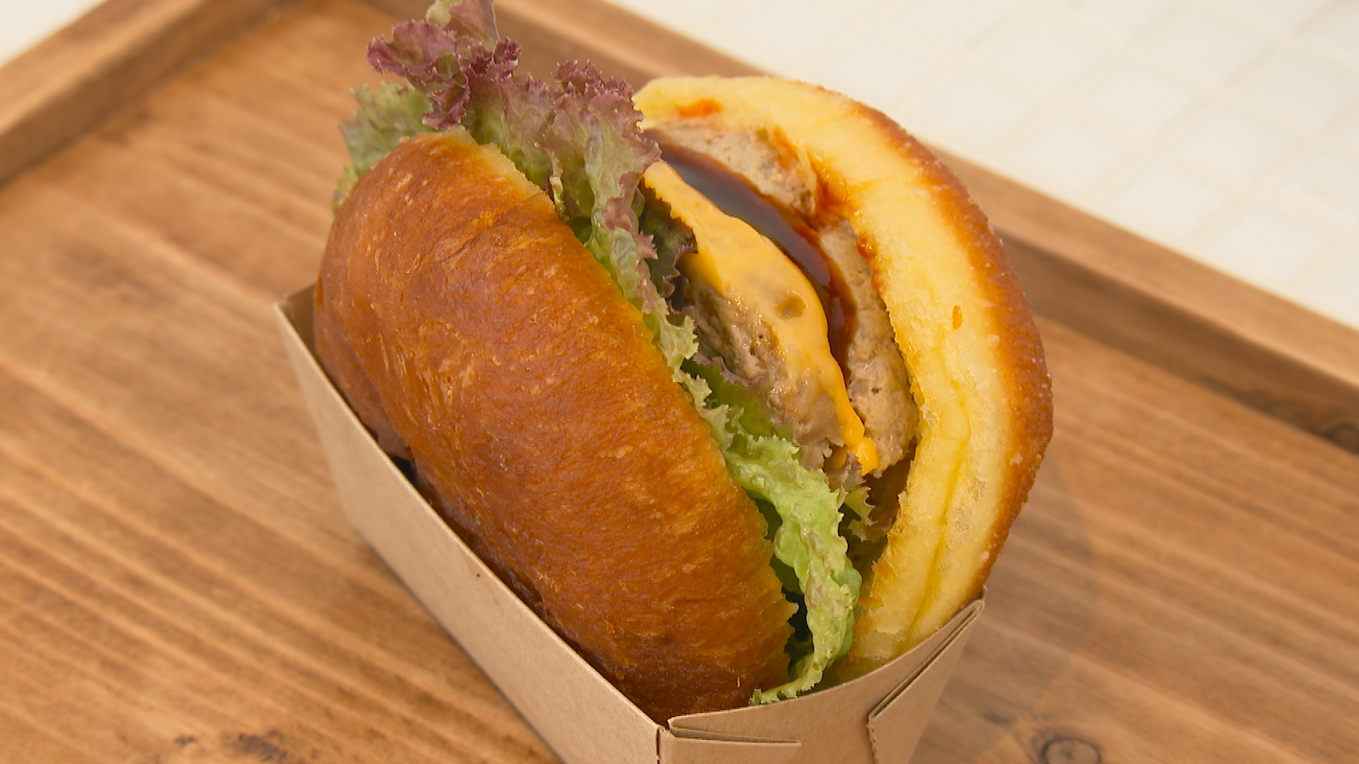 中でも人気の「ハンバーグサンド」(528円)は、ふわっと柔らかいドーナツ生地に、生地に合うように調整した5:5の合い挽き肉を使った手作りハンバーグとチーズをサンド。BBQソースが食欲をそそるおかず系ドーナツです。