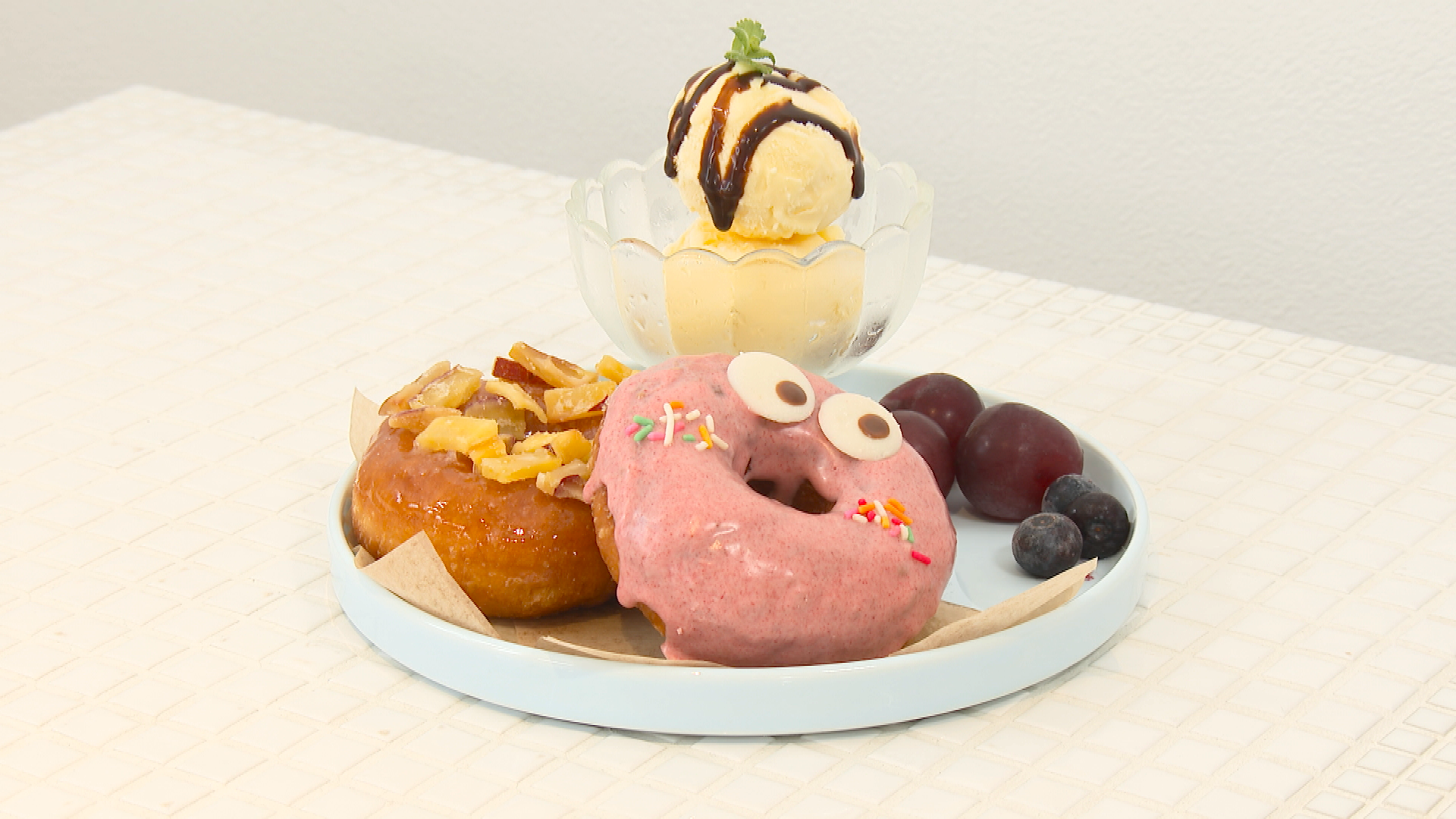 好きなドーナツ2つに、バニラアイスと季節のフルーツが添えられた贅沢なプレートセットは、見た目でもテンションが上がる一皿です。