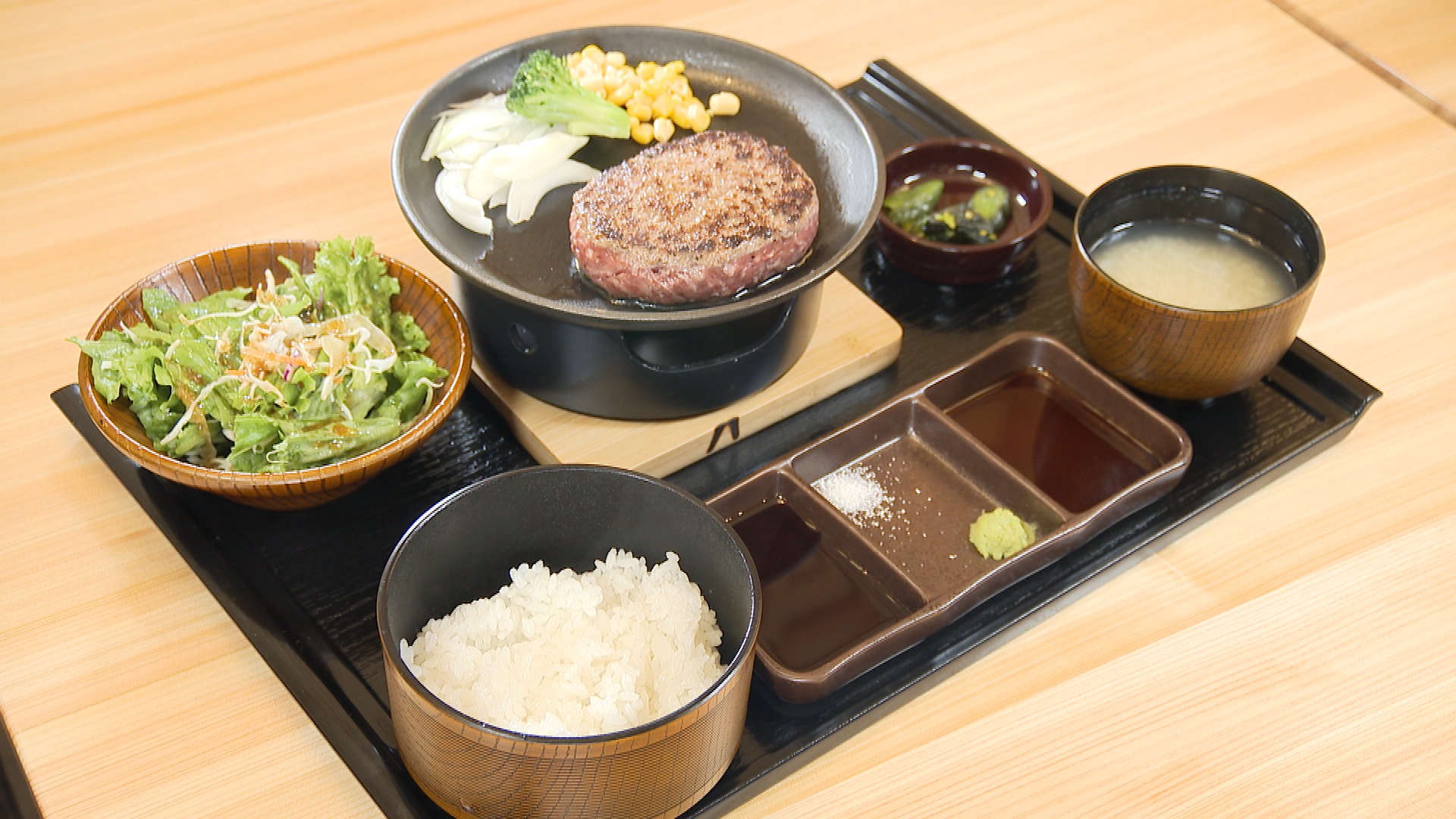 人気メニュー「とろけるハンバーグ御膳(Sサイズ)」(1,890円)は、小麦や卵、乳製品などのつなぎを一切使わず、黒毛和牛と国産牛のみで作られています。