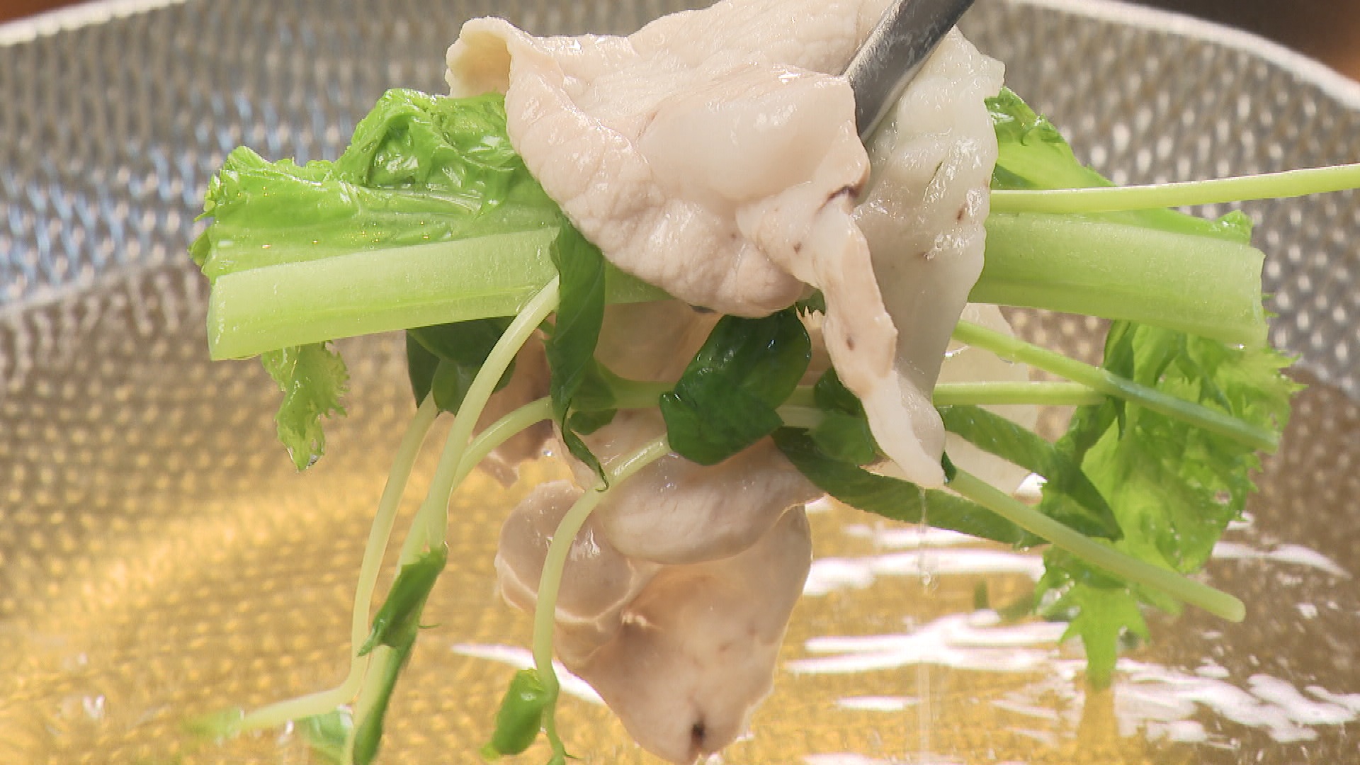 出汁のおすすめは、カツオなど魚介をベースにした「秘伝出汁」。奥出雲ポークで野菜を巻いて一緒に食べることで、豚肉のとろける脂とシャキシャキ野菜の食感のコントラストが絶妙なハーモニーを生み出します。