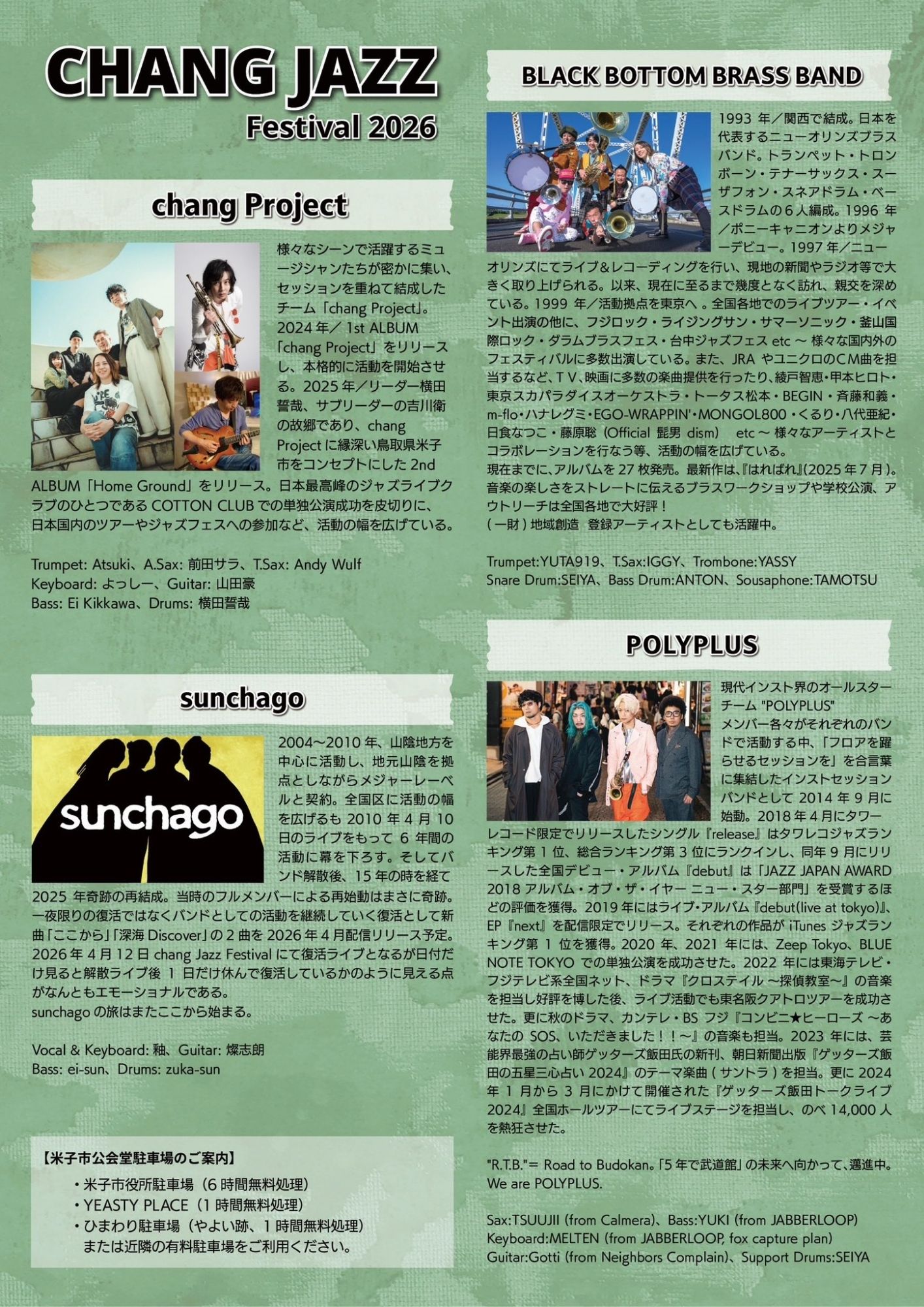 | 出演 | chang Project、BLACK BOTTOM BRASS BAND、sunchago、POLYPLUS |